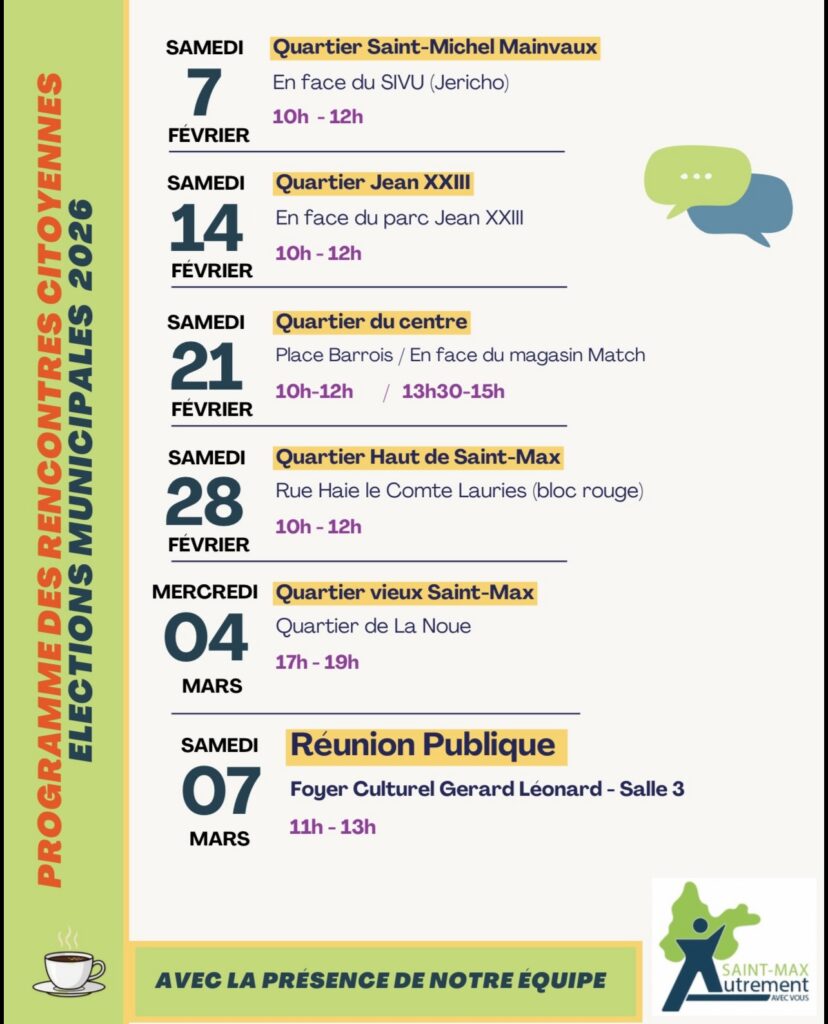 🤝 Rencontres citoyennes : votre parole compte ! Parce que Saint-Max se construit avec celles et ceux qui y vivent ! Nous venons Ă  votre rencontre 💬Échanger, Ă©couter vos idĂ©es, vos prĂ©occupations et construire ensemble l’avenir de nos quartiers : c’est l’objectif de ces temps de discussion ouverts Ă  toutes et tous. đź‘ĄCes temps d’échanges sont ouverts Ă  toutes et tous — n’hĂ©sitez pas Ă  passer nous voir, mĂŞme quelques minutes !